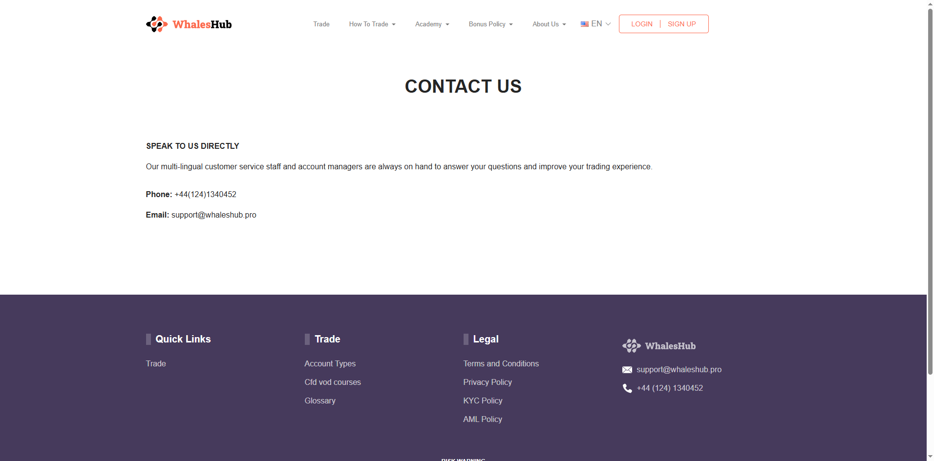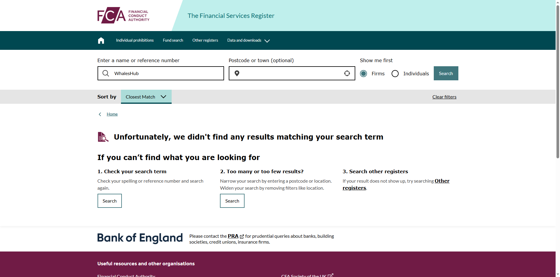 WhalesHub appears to be an unsafe trading platform. It does not display any licensing or regulatory information on its website, raising serious concerns about its legitimacy. Based on the contact number provided, the platform appears to be based in the United Kingdom. However, a search with the UK Financial Conduct Authority (FCA) reveals no matching registration, indicating that WhalesHub is not authorized or regulated in the UK. Therefore, WhalesHub appears to operate without authorization and be a scam.