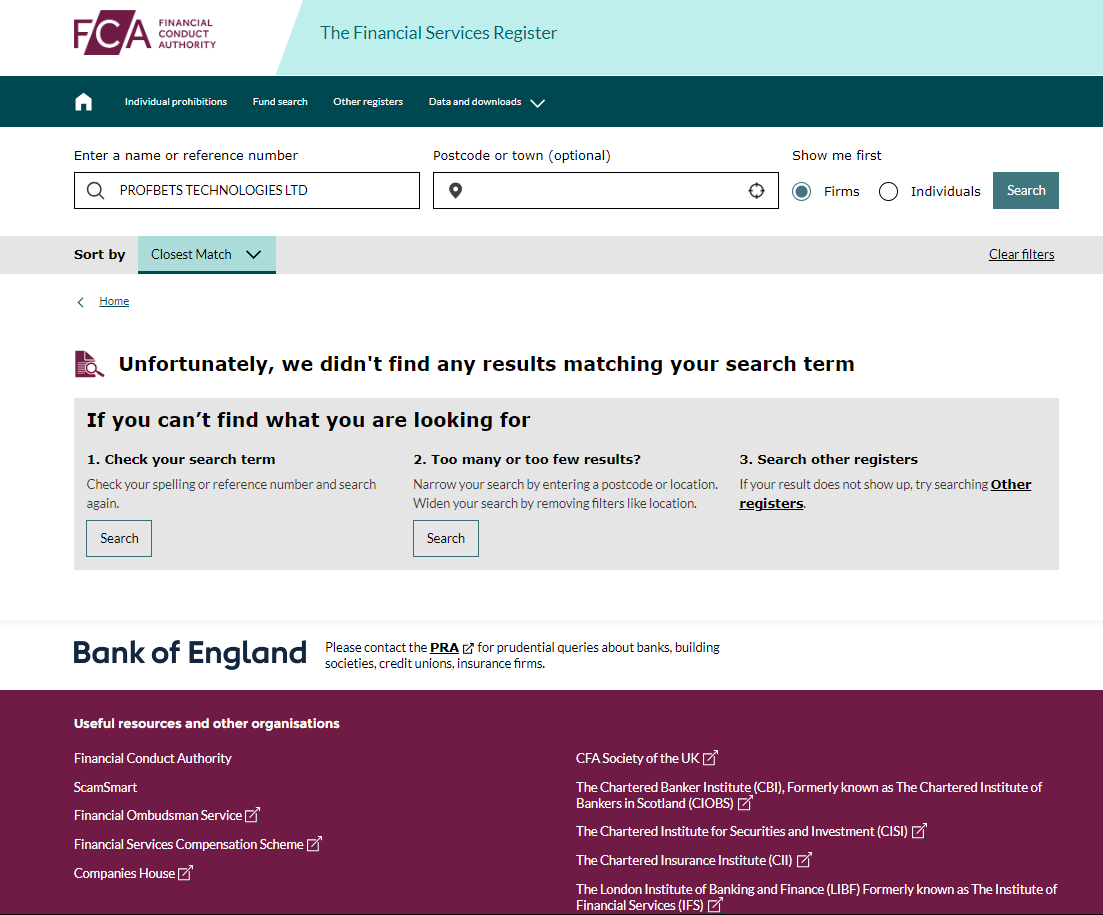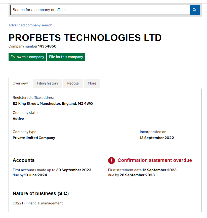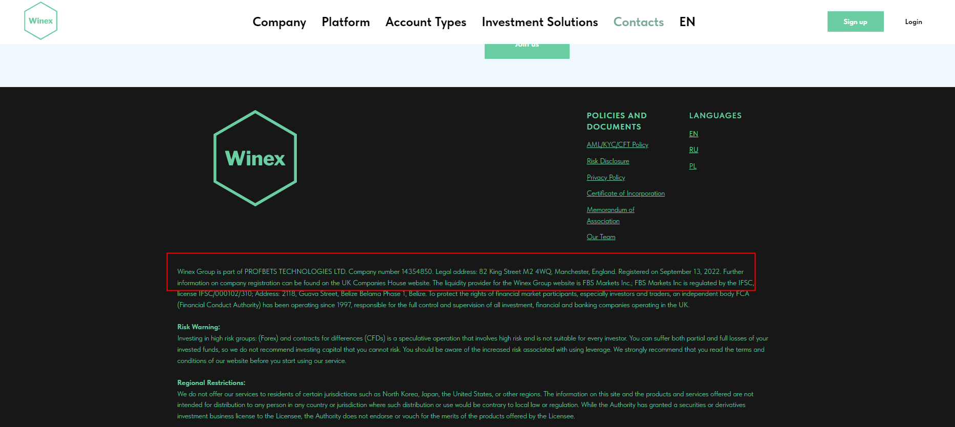 According to its website, Winex Group is part of PROFBETS TECHNOLOGIES LTD. Company number 14354850 and register at UK Companies House (CH), upon investigation, we found the company information in the CH, but the details shows Confirmation statement overdue. In addition, it located in the UK, however, we didn't find any matching information in the Financial Conduct Authority (FCA).