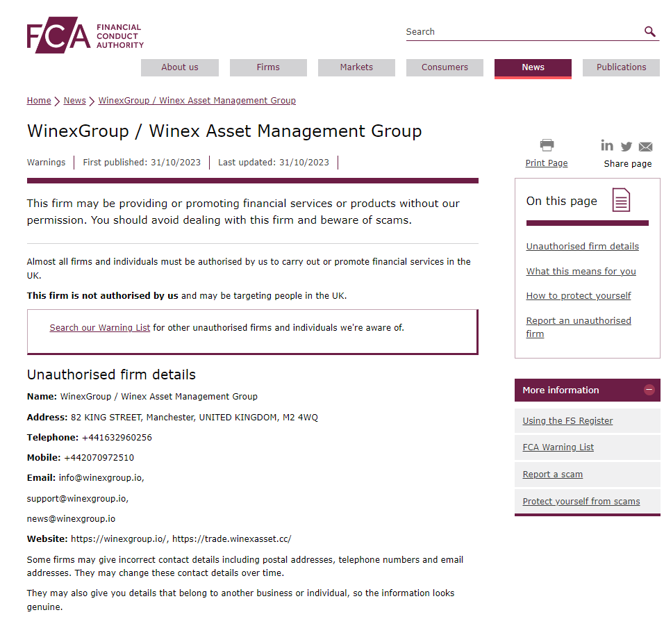 The United Kingdom Financial Conduct Authority (UK FCA) issued a warning that WinexGroup was providing finacial services or products without authorisation.