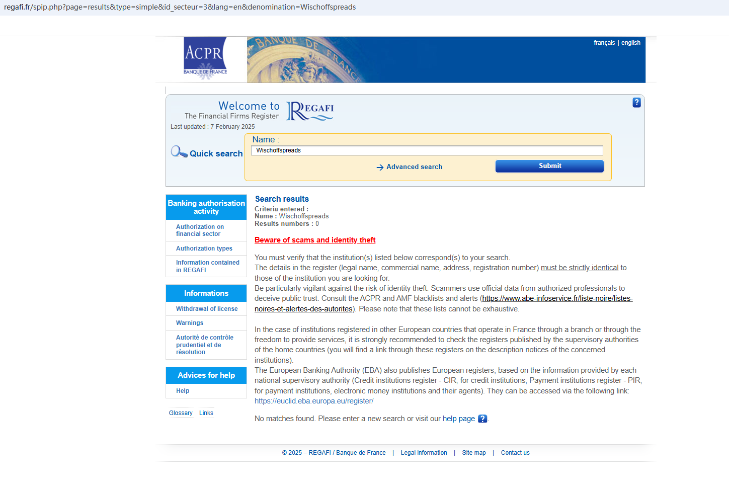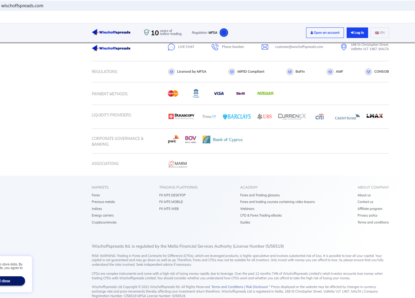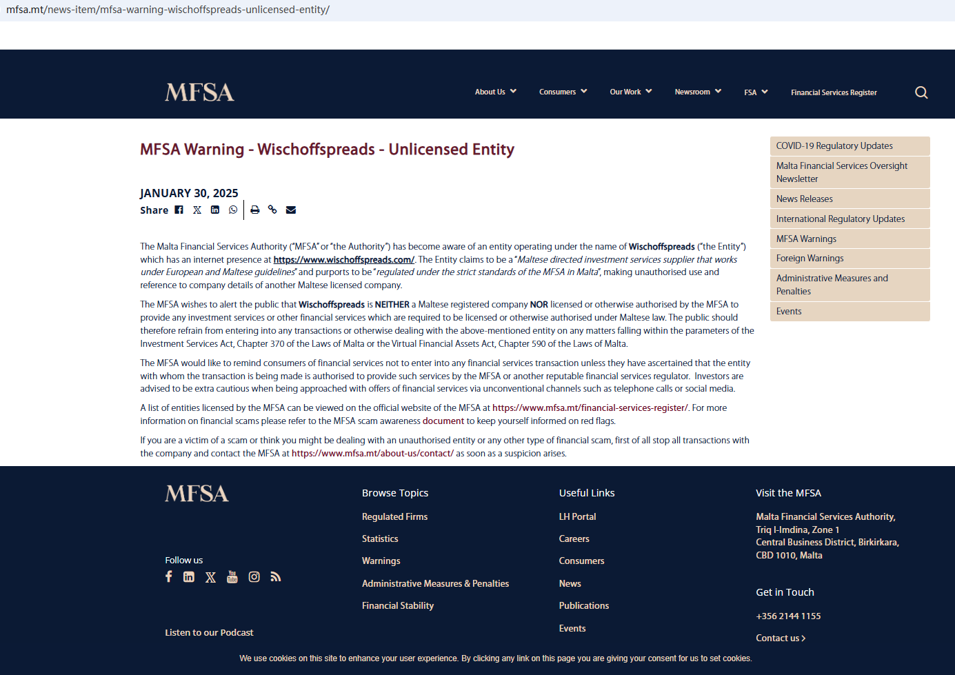 In addition, the Malta Financial Services Authority (MFSA) issued a warning against Wischoffspreads, stating this broker is neither a Maltese registered company nor licensed or otherwise authorised by the MFSA to provide any investment services or other financial services which are required to be licensed or otherwise authorised under Maltese law.
