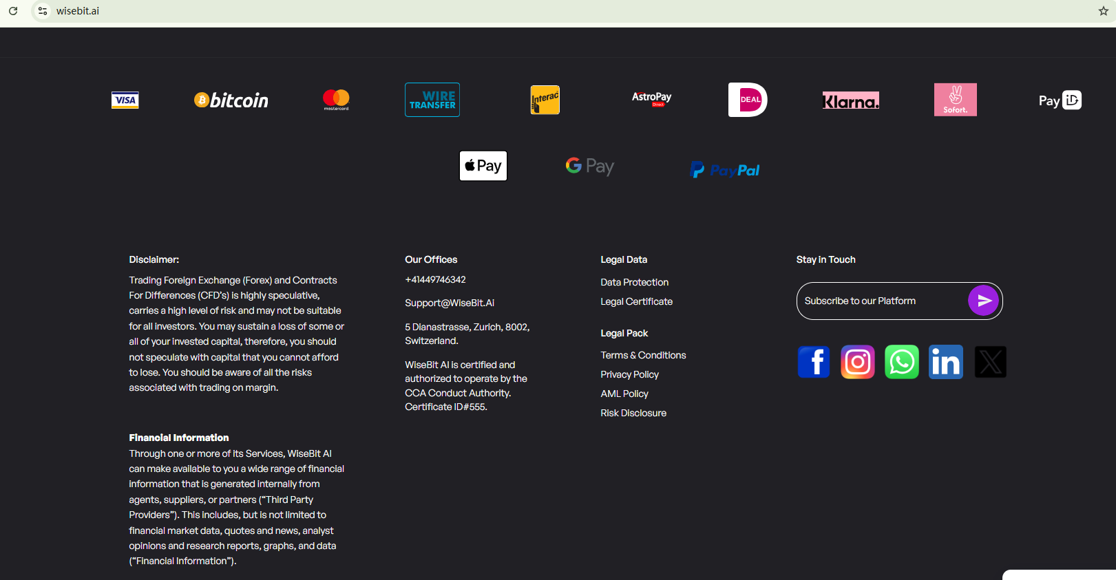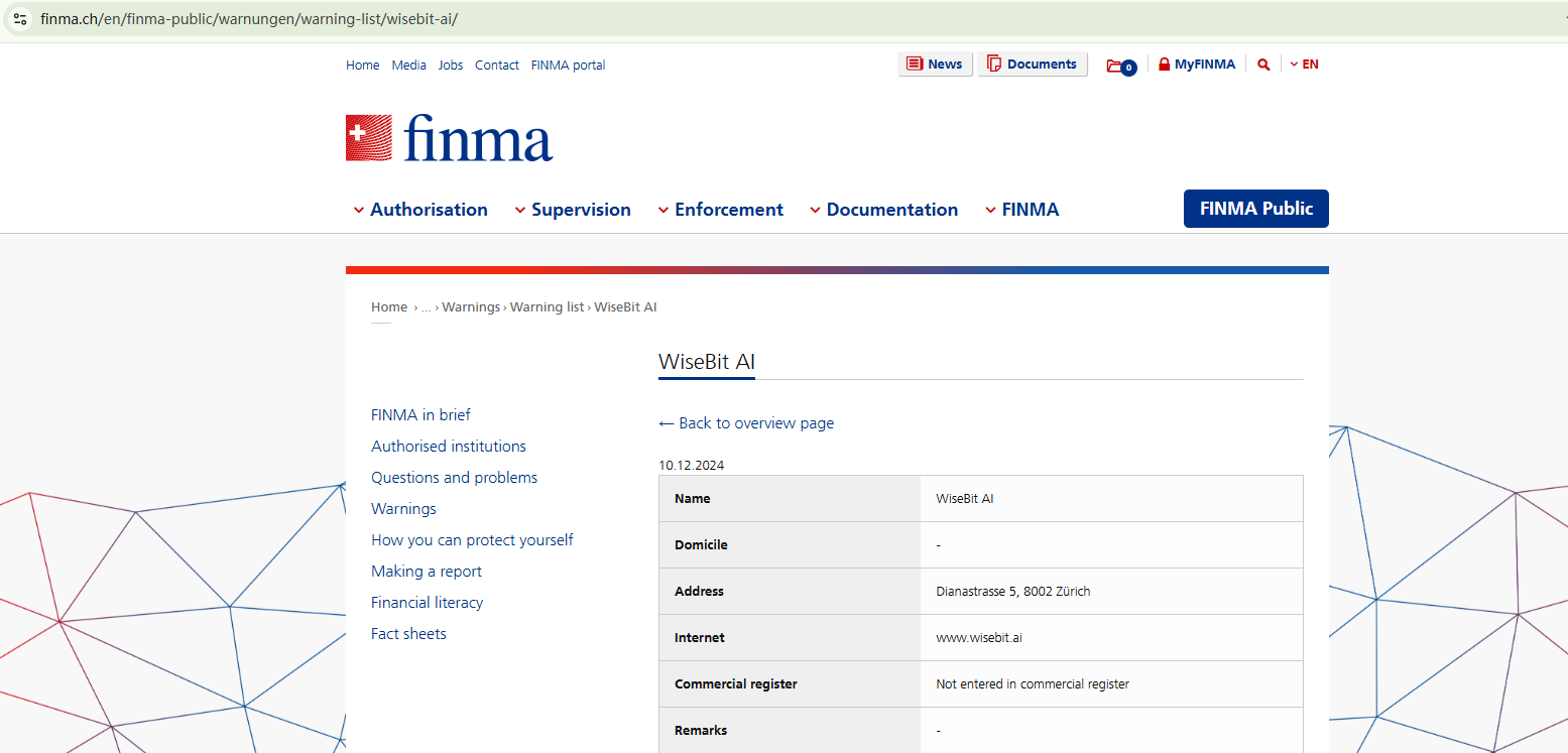 WiseBit AI claims to be authorized by a non-existing regulatory authority, CCA Conduct Authority, to mislead investors into believing they are real. This is a significant fraud practice. While the company purports to be based in Switzerland, the Swiss Financial Market Supervisory Authority (FINMA) has issued a warning against WiseBit AI for being absent from the commercial register.