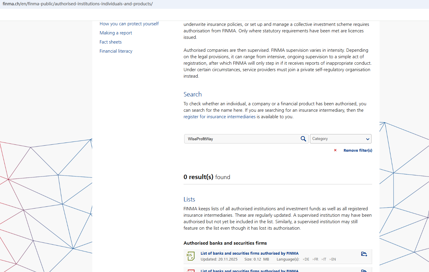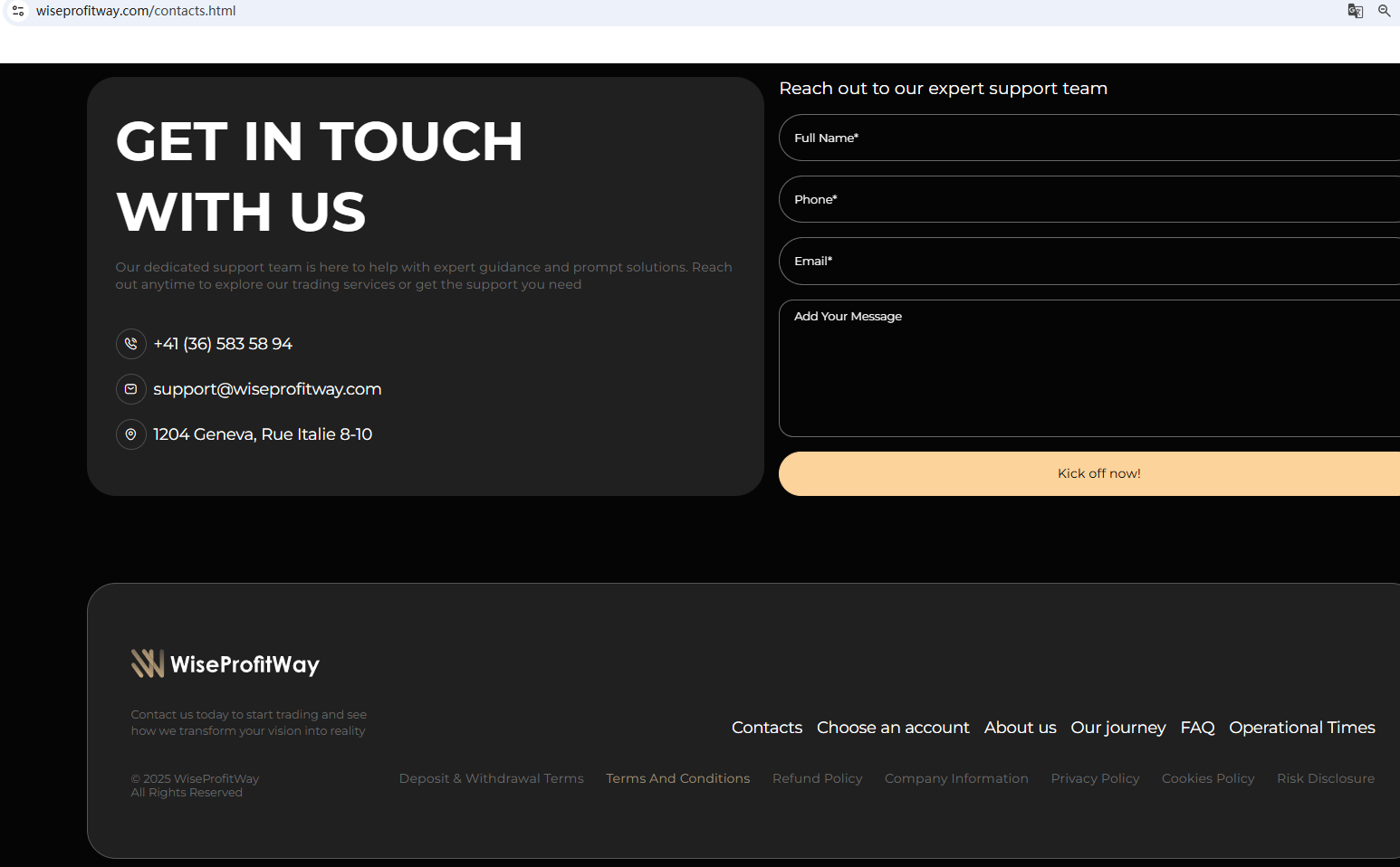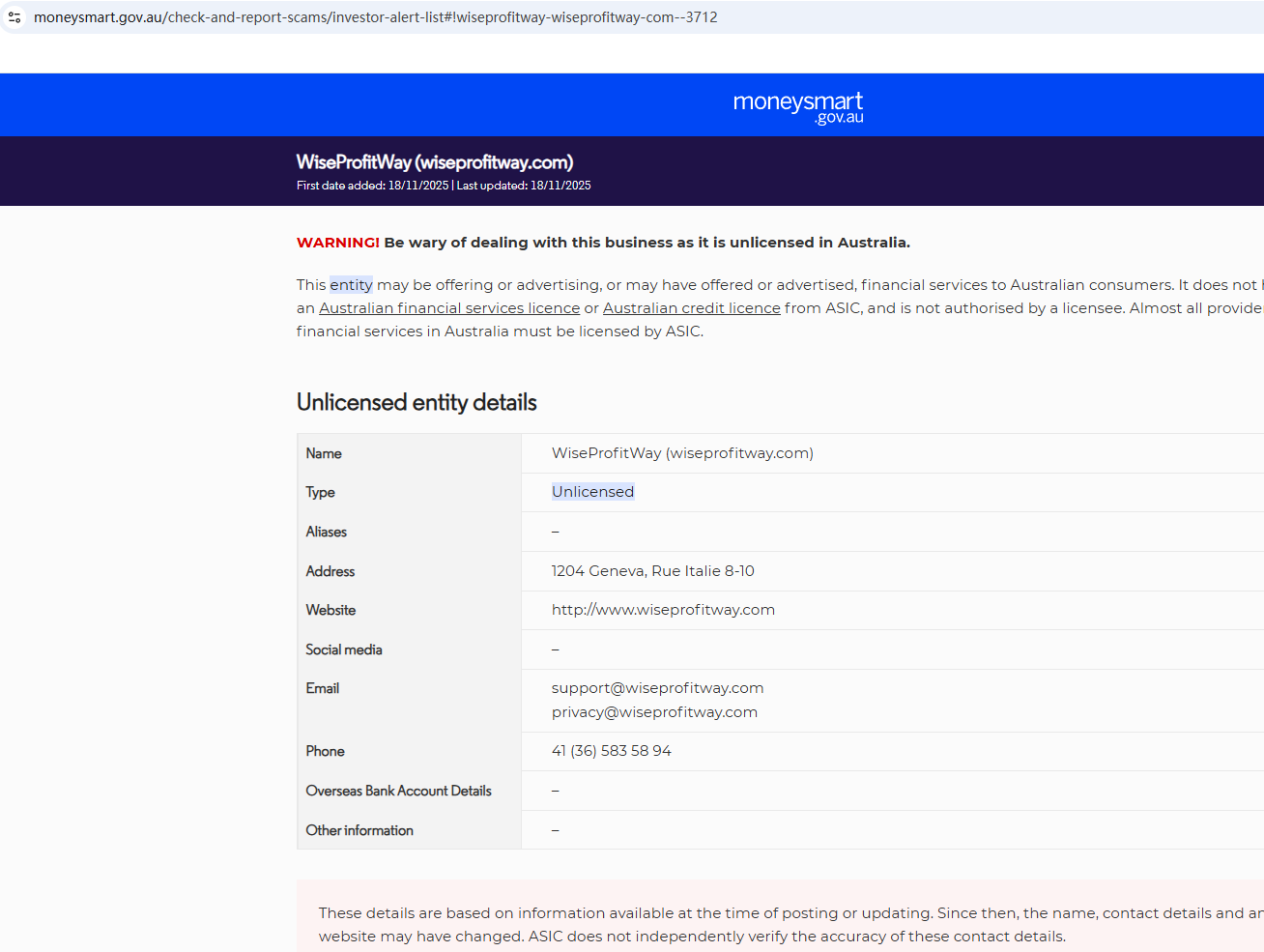 According to its website, its office address is located in Geneva. A search yielded no matching information in the Swiss Financial Market Supervisory Authority (FINMA). In addition, the Australian Securities & Investments Commission (ASIC) issued a warning against WiseProfitWay, believing this company might be providing financial services or products without proper authorization.