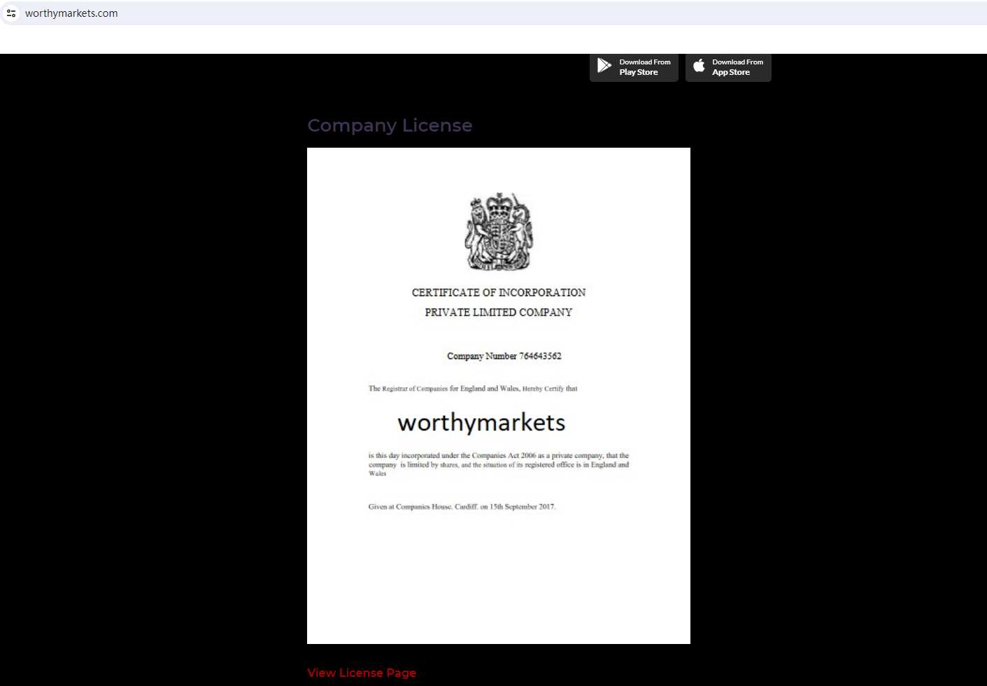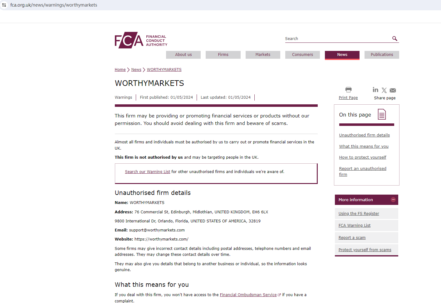 On 1 May 2024, the United Kingdom Financial Conduct Authority (UK FCA) issued a warning that WORTHYMARKETS was providing financial services or products in the UK without authorisation. You may visit: https://www.fca.org.uk/news/warnings/worthymarkets