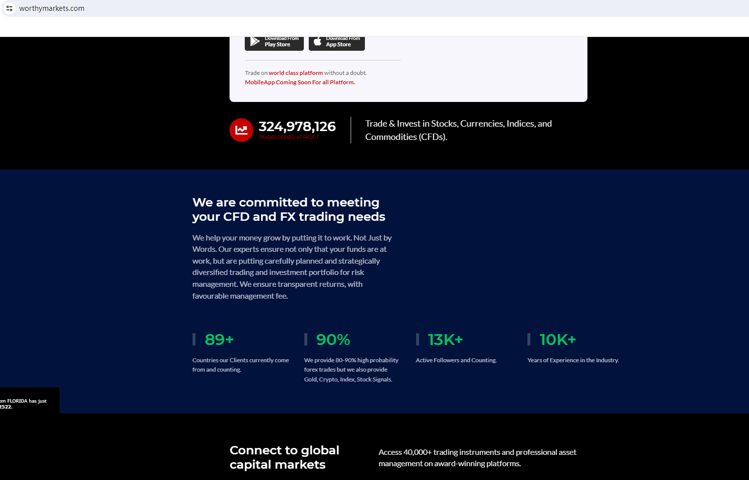 BrokersView found that the domain "https://worthymarkets.com/" is currently inaccessible. This is widely regarded as a significant red flag, as the suspension of a broker's website often points to underlying regulatory or operational issues.