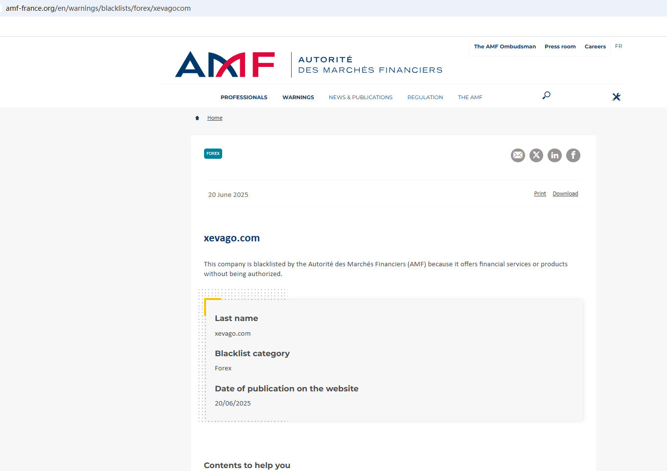 On June 20, 2025, the Financial Authority (Autorité des Marchés Financiers, AMF) added Xevago to warning list for it being an unauthorized company engaging in forex activities. https://www.amf-france.org/en/warnings/blacklists/forex/xevagocom