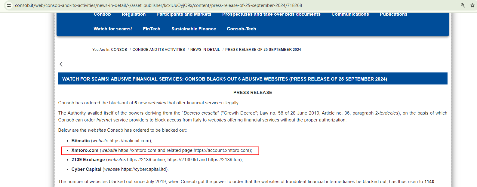 On September 25, 2024, the Italian Companies and Exchange Commission (CONSOB) ordered Xmtoro's website to be blacked out since it offers financial services illegally in Italy. https://www.consob.it/web/consob-and-its-activities/news-in-detail/-/asset_publisher/kcxlUuOyjO9x/content/press-release-of-25-september-2024/718268