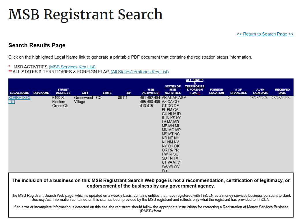 XORKETS FX claims to be the trading name of Xorkets FX Ltd, which is regulated by the Money Services Business (MSB) under license number 31000307035297. While a registration record for this MSB number can indeed be found in the Financial Crimes Enforcement Network (FinCEN) database, it is crucial to understand that FinCEN does not regulate forex trading activities.