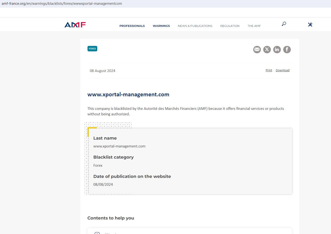 In addition, the Financial Authority (Autorité des Marchés Financiers, AMF) added XPORTAL to warning list for it being an unauthorized company engaging in forex activities.