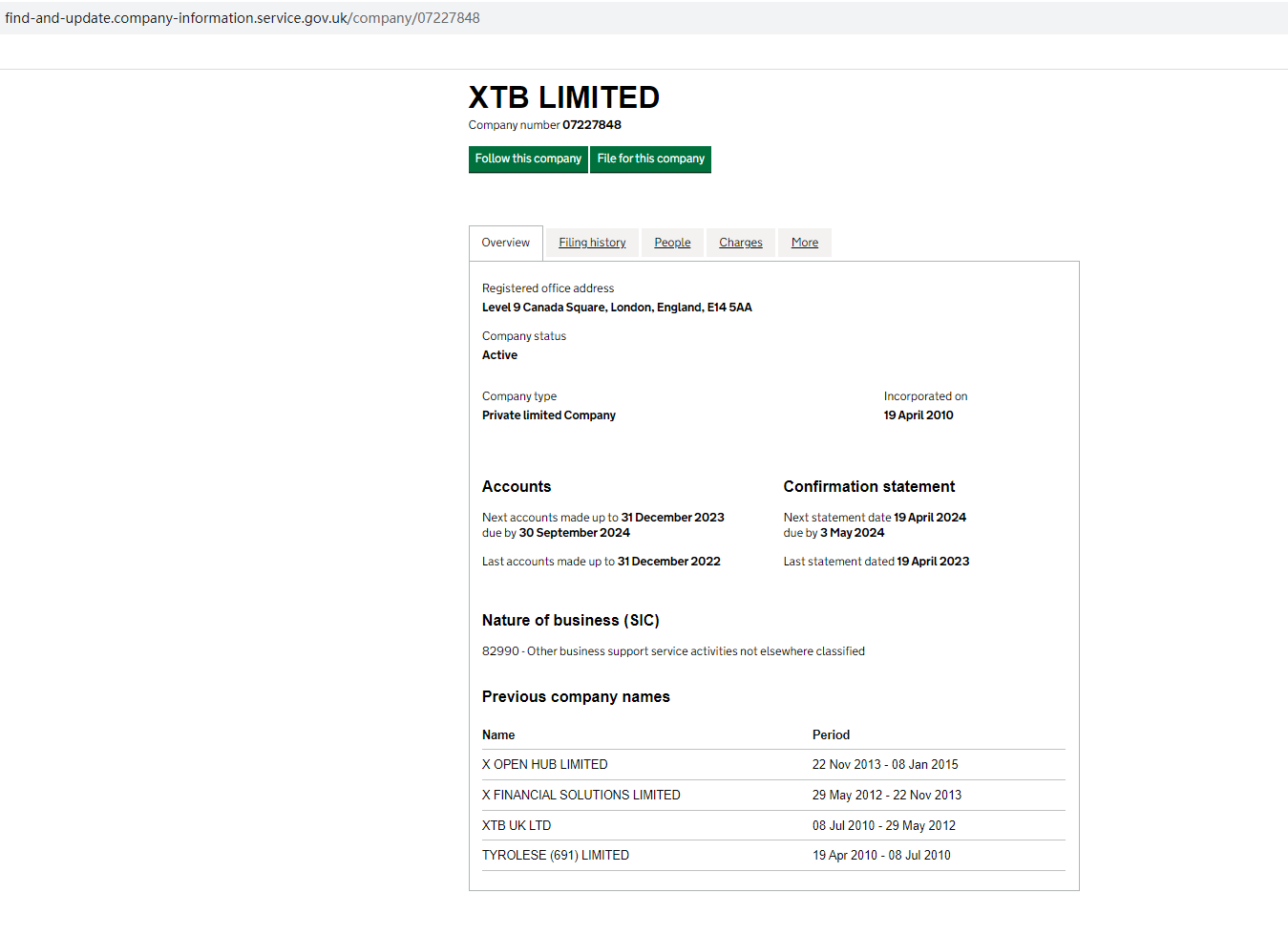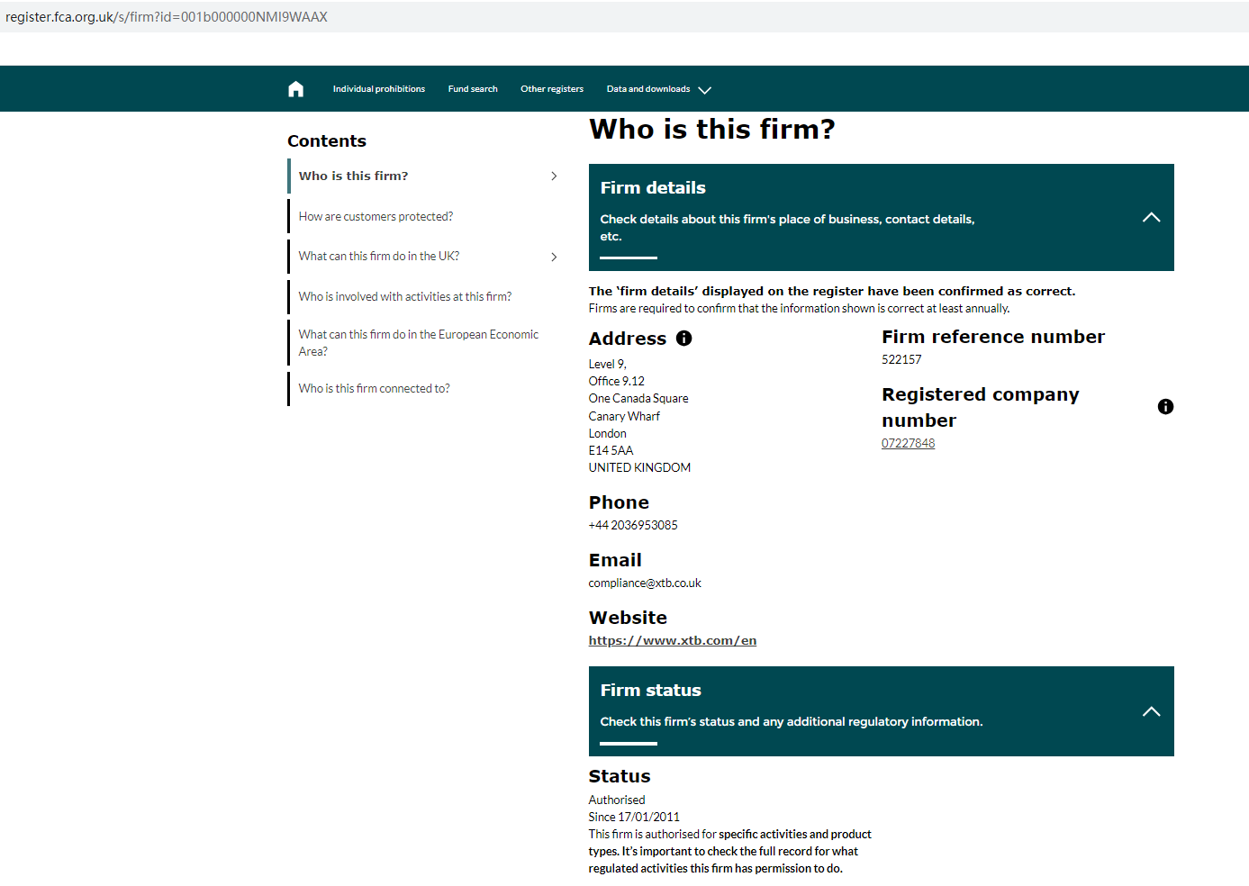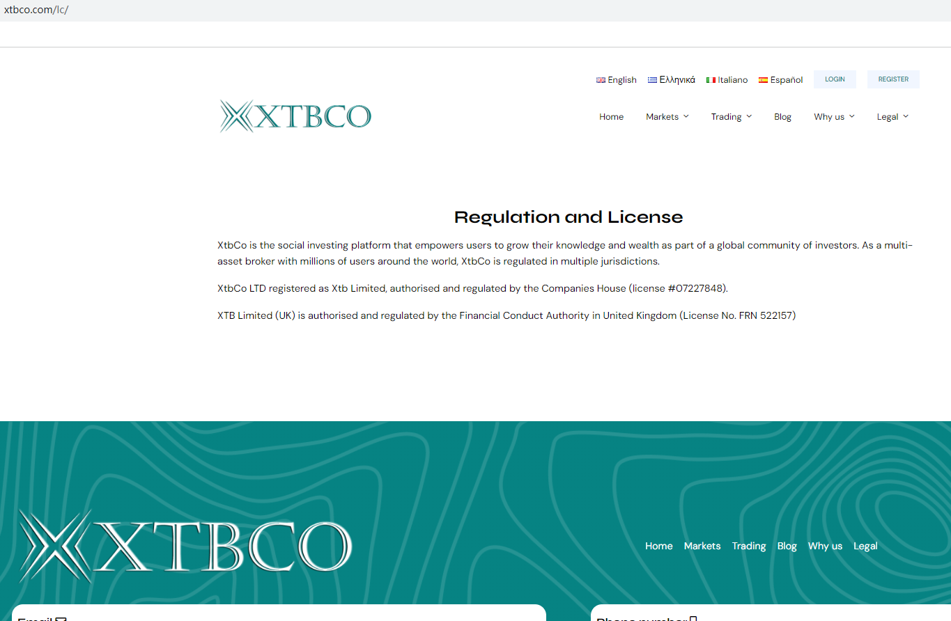 According to its website, XTBCO claims to be regulated by the Financial Conduct Authority (FCA) with registration number 522157, and by Companies House (CH) with registration number 07227848. Upon investigation, we found a company named XTB Limited. However, the companies listed on the FCA and CH databases do not match XTBCO's address, company name, or other information. It appears that XTBCO has illegally copied the regulatory information of other companies to deceive investors.