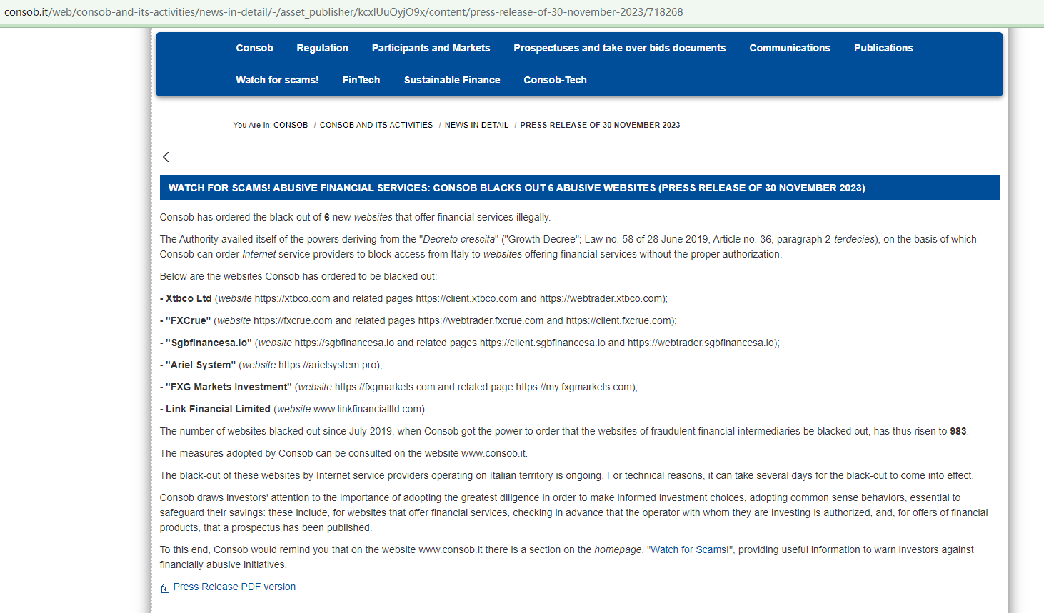 In addition, the Commissione Nazionale per le Società e la Borsa (CONSOB) issued a warning that XTBCO was providing financial services or products in the UK without authorisation.