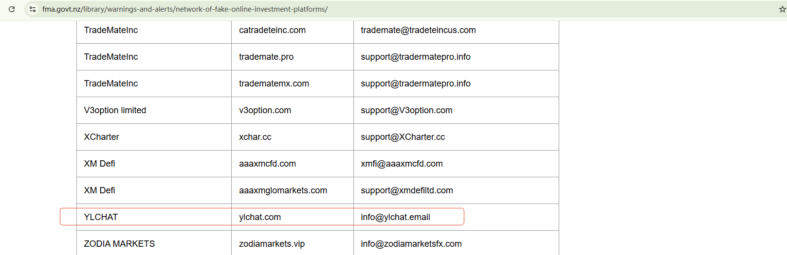On February 17, 2025, the New Zealand Financial Markets Authority (NZ FMA) released a warning list, advising investors to stay vigilant about 96 suspicious investment websites including YLCHAT. https://www.fma.govt.nz/library/warnings-and-alerts/network-of-fake-online-investment-platforms/
