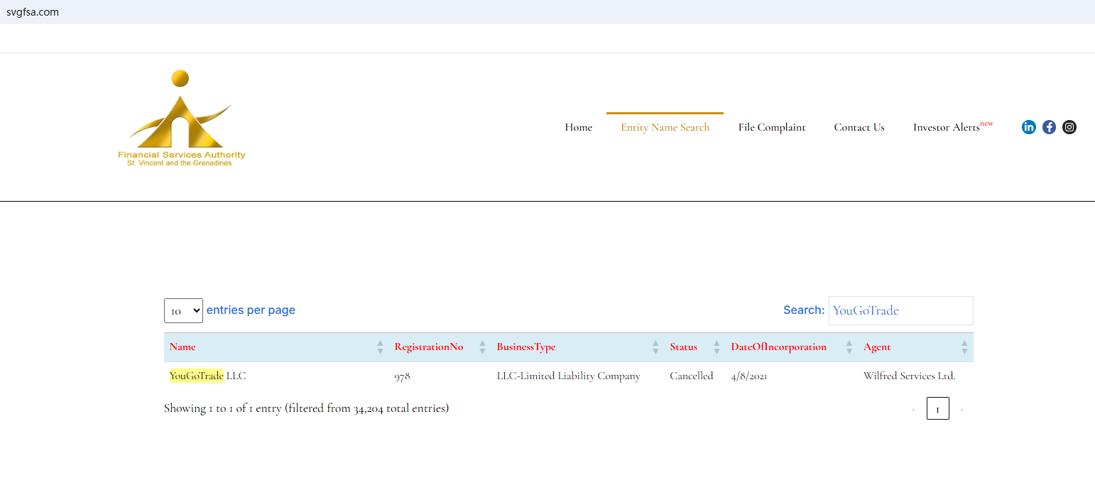 The website of YouGoTrade is currently unavailable. The claimed registration with the Financial Services Authority of St. Vincent and The Grenadines (SVG FSA) has been canceled as well. All the signs indicate substantial risks of YouGoTrade. Investors should be informed about the development and stay clear of it.