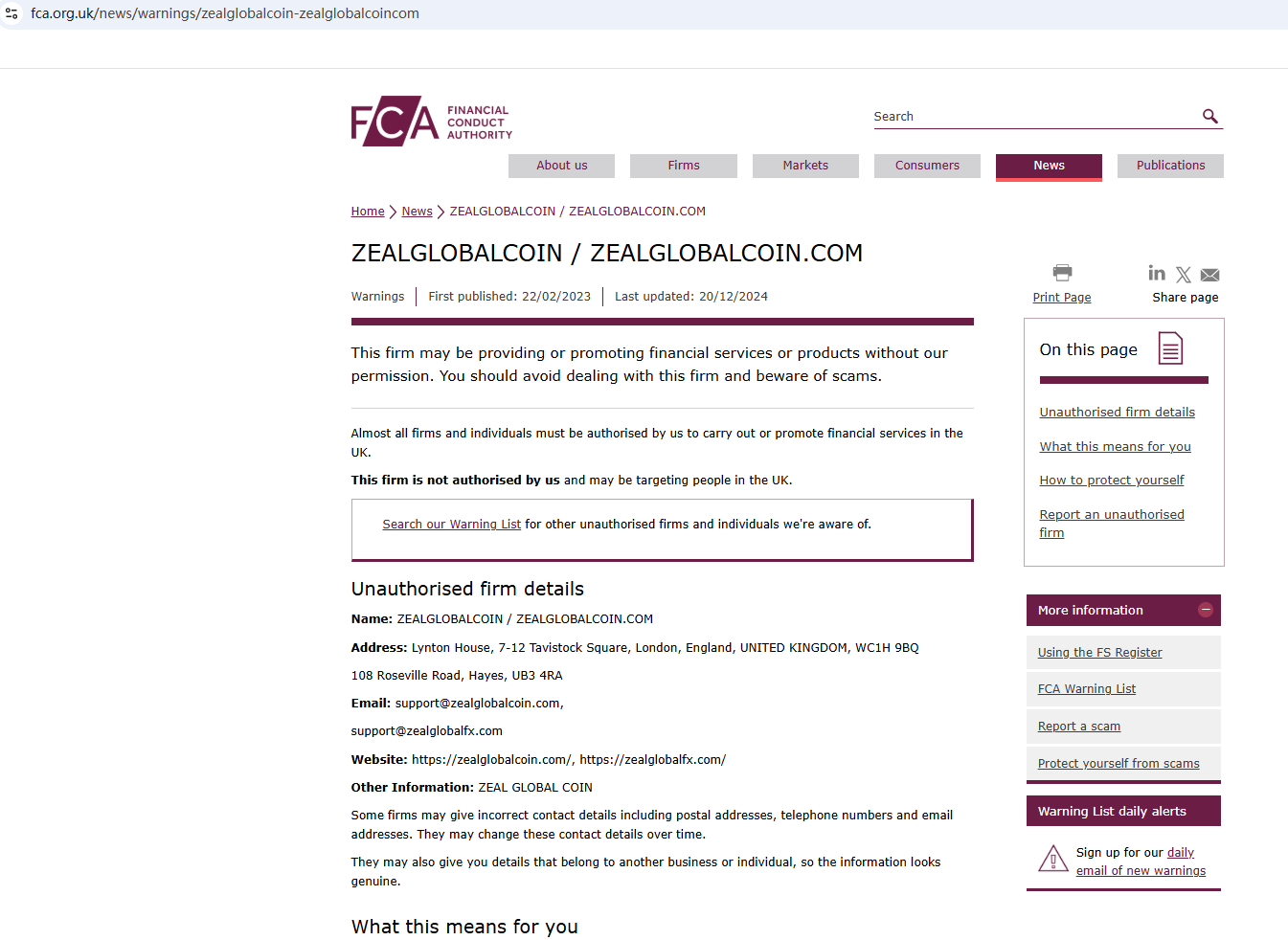 On 22 Feb 2023, the United Kingdom Financial Conduct Authority (FCA) issued a warning that Zealglobalcoin may be providing financial services or products in the UK without authorization. You may visit: https://www.fca.org.uk/news/warnings/zealglobalcoin-zealglobalcoincom