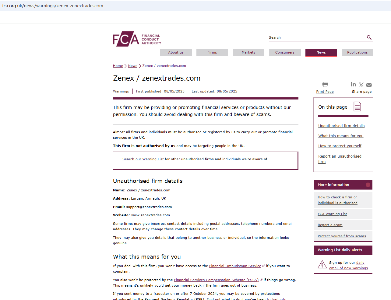 On May 8, 2025, the Financial Conduct Authority (FCA) issued a warning against Zenex (zenextrades.com), believing this company might be providing financial services or products without proper authorization in the UK. https://www.fca.org.uk/news/warnings/zenex-zenextradescom
