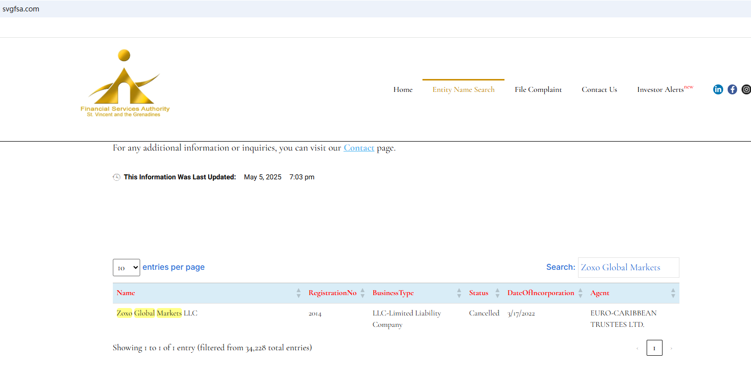 The website of Zoxo Global Markets is currently unavailable. The claimed registration with the Financial Services Authority of St. Vincent and The Grenadines (SVG FSA) has been canceled as well. All the signs indicate substantial risks for Zoxo Global Markets. Investors should be informed about the development and stay clear of it.
