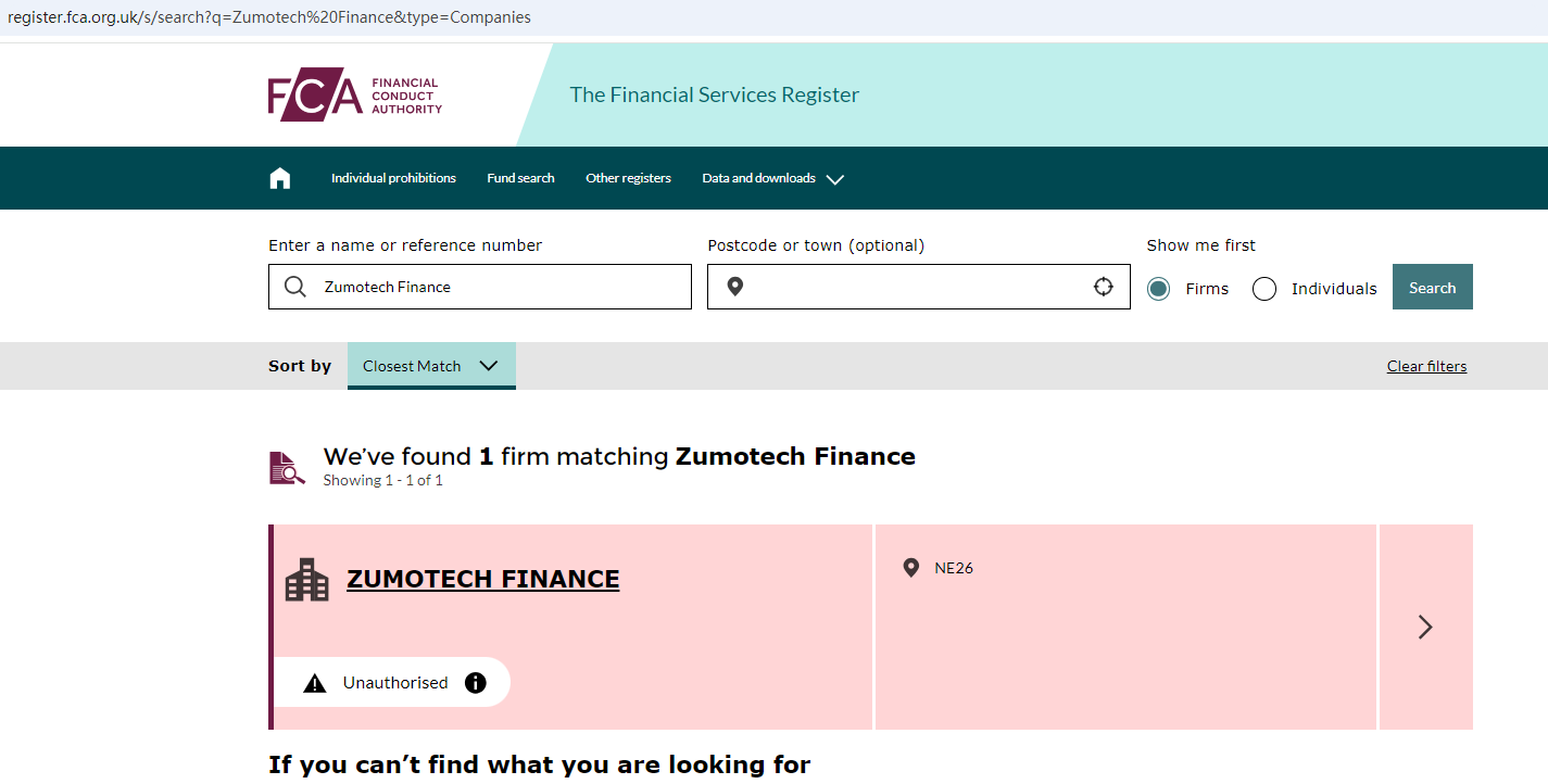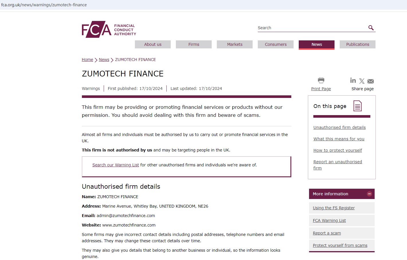 On 17th October 2024, the United Kingdom Financial Conduct Authority (FCA) issued a warning against ZUMOTECH FINANCE, believing this company might be providing financial services or products without authorisation in the UK. You may visit: https://www.fca.org.uk/news/warnings/zumotech-finance.