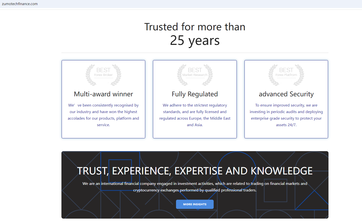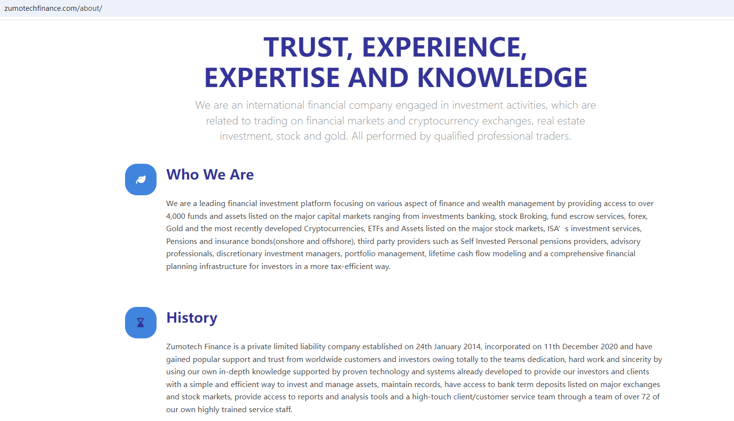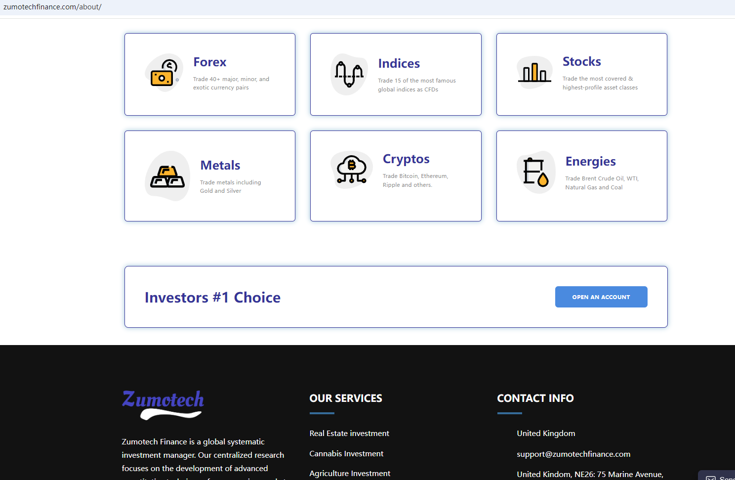 Zumotech Finance claims to be fully licensed and regulated, is an international financial company located in the United Kingdom, offering a range of investment products to traders, including Forex, Indices, Stocks, Metals, Cryptos, Energies and more instruments for trading in global markets. But there is no detailed financial services licenses and other licensing certificates. A company that offers financial services must have financial license in the country where it is located.